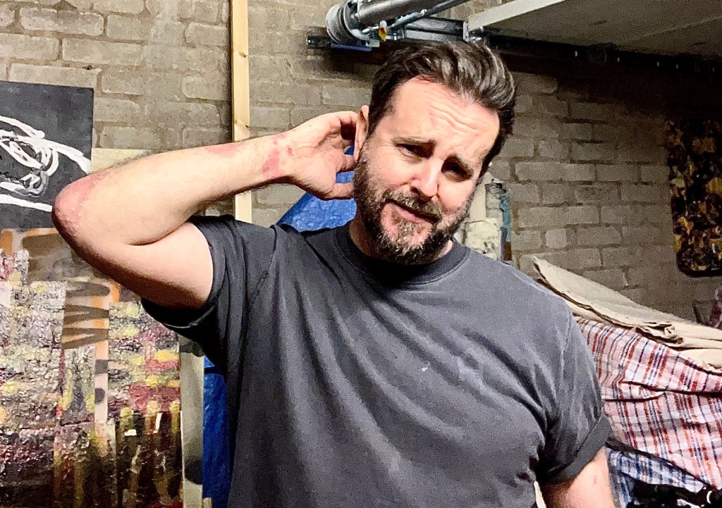 I like to work directly and spontaneously onto canvas, however I also rely on an evolving library of processes and ‘post production’ to progress and finalize my work.